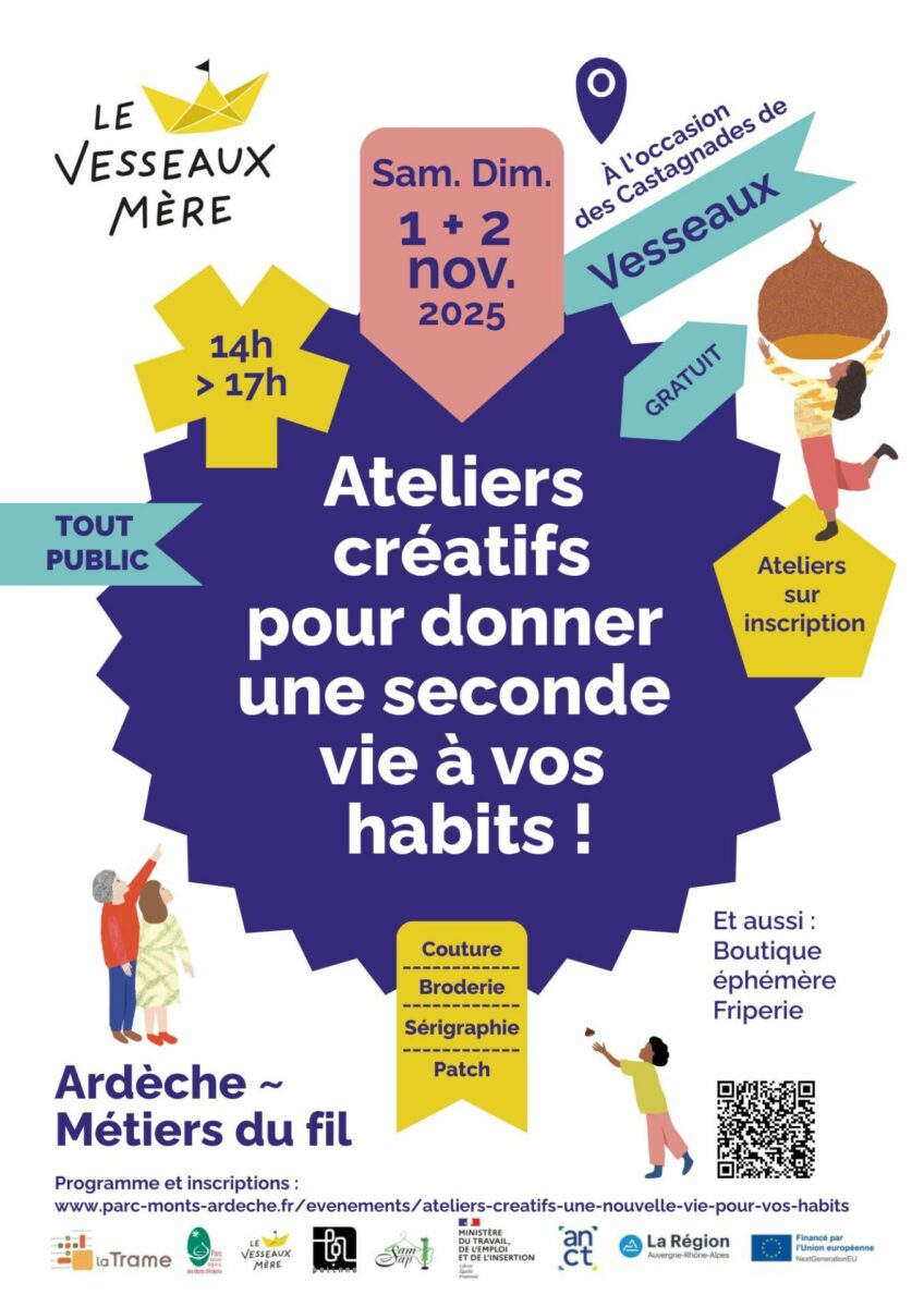 À l’occasion des Castagnades de Vesseaux, les artisanes et artistes textiles du projet Ardèche – Métiers du fil vous donnent rendez-vous au Vesseaux-Mère pour découvrir comment réparer et personnaliser vos vêtements avec créativité. Retrouvez également l’Armoire à puce, friperie, et une boutique éphémère pendant les deux jours de l’événement.