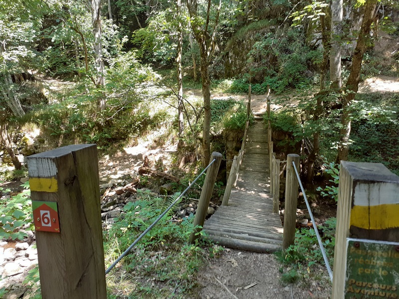 Passage sur la Dolce Via, une traversée insolite sur un pont suspendu, des ruines étonnantes, de beaux paysages avec une arrivée sur le Mont Chiniac et les mires du parcours artistique LE PARTAGE DES EAUX.