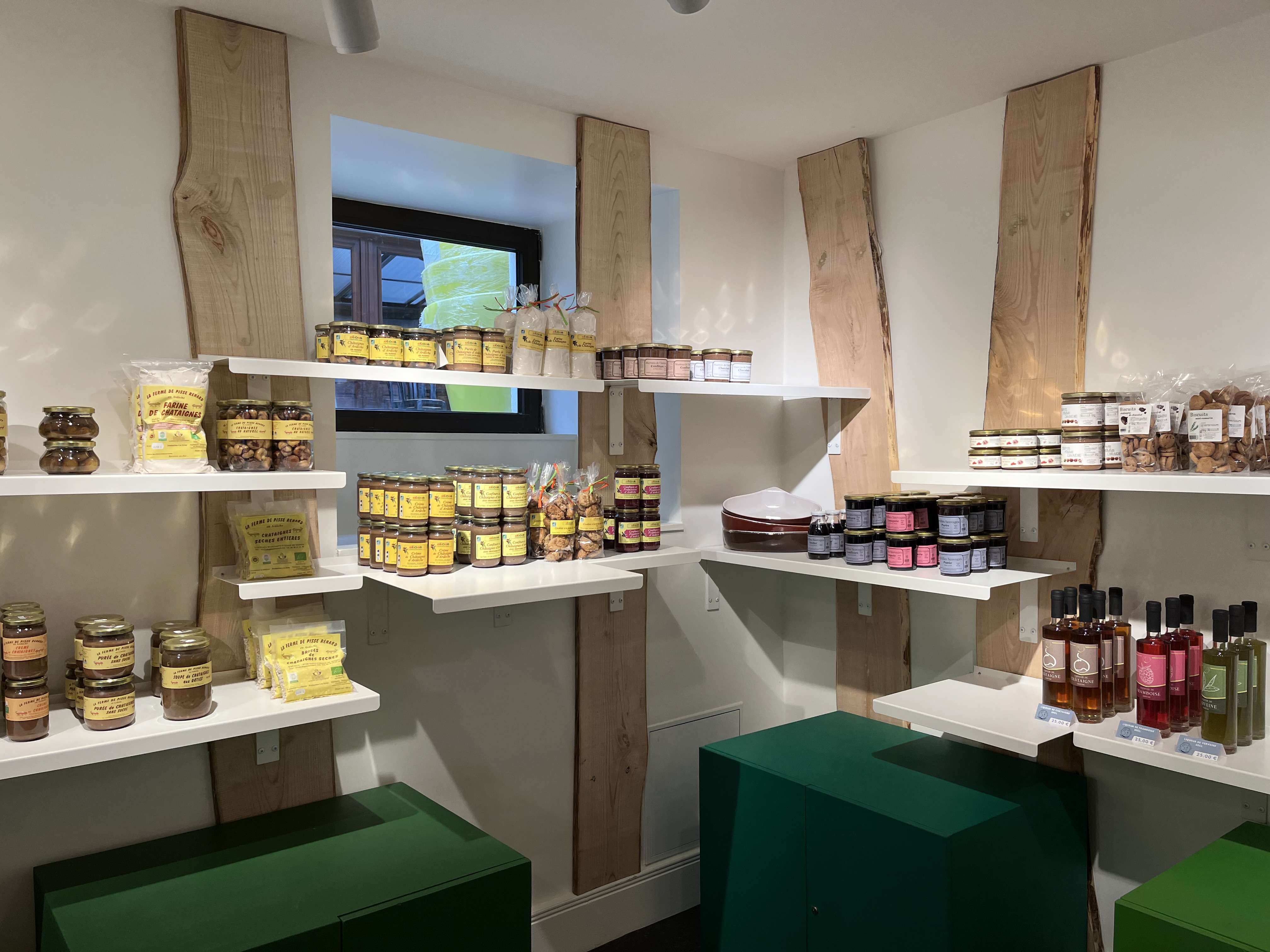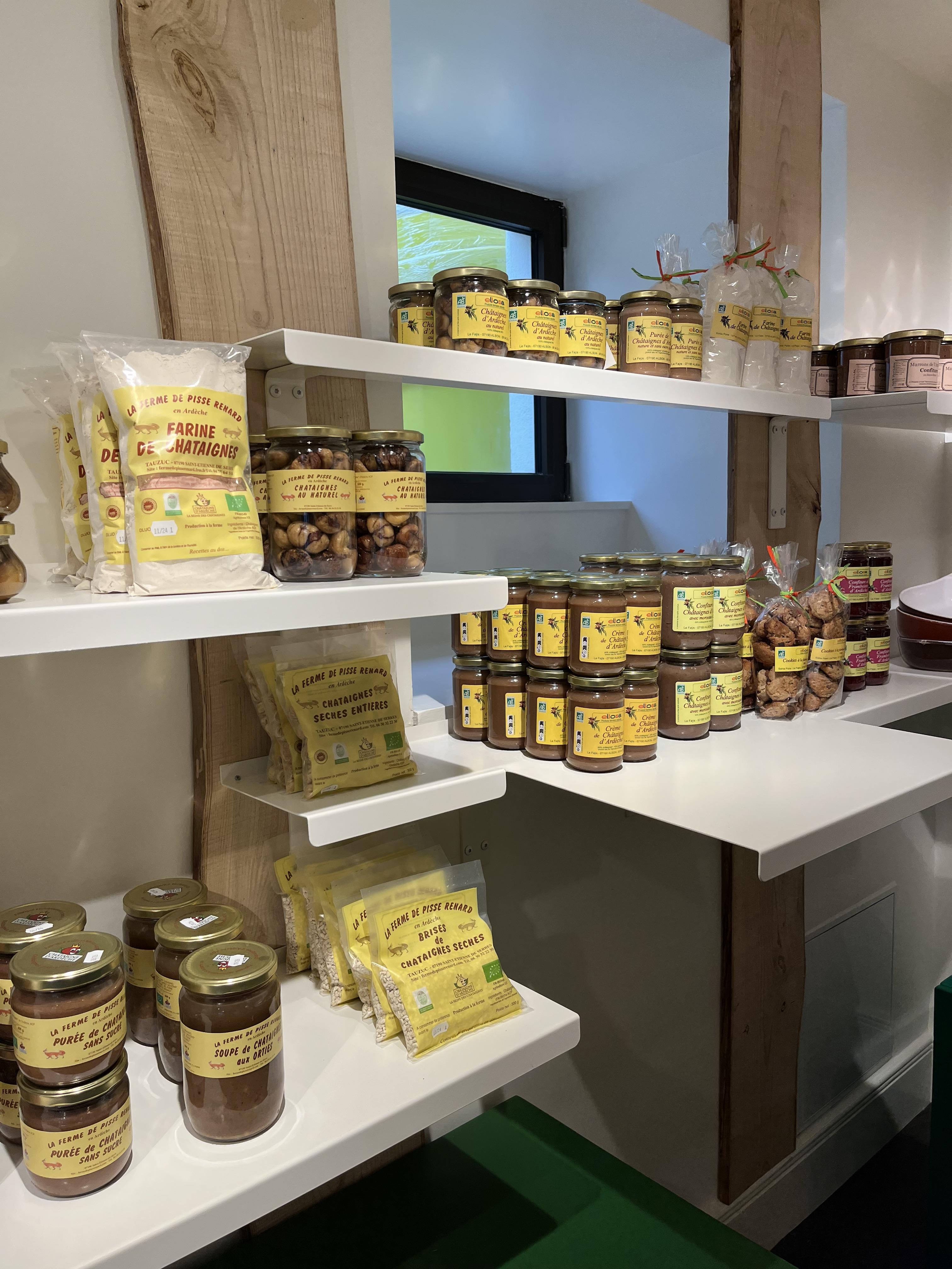 La boutique de la Maison propose une large gamme de produits locaux et gourmands : crèmes de marrons traditionnelles ou parfumées, produits à la myrtille, farine, confitures, miel, biscuits et autres gourmandises. Régalez-vous !